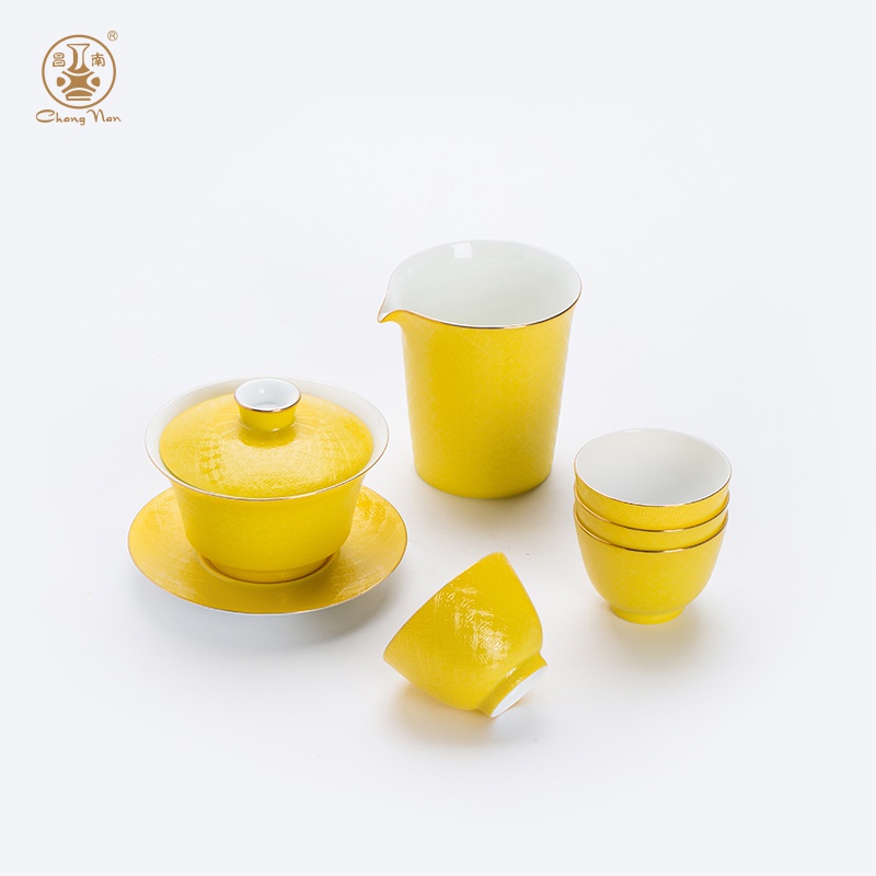 粉彩扒花格桑花系列帝王黄8头盖碗套装