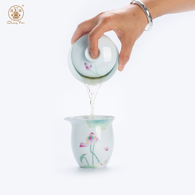 玉瓷手绘“映日荷花”8头盖碗茶具套装